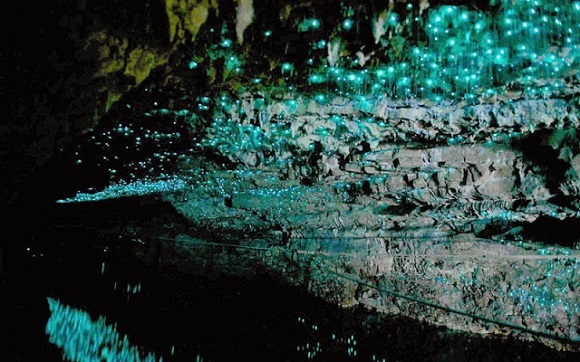Las cuevas de Waitomo están situadas en Nueva Zelanda. Son unas cuevas de roca calcárea que forman grutas que tienen como mayor particularidad la existencia de un gusano luminoso en el techo de las cuevas. El gusano luminoso es la larva del insecto Arachnocampa luminosa, el cuál emite una luz brillante con la que atrae su presa acercándola a un hilo mucoso en el que el insecto atraído queda pegado con lo que el gusano retira el hilo y coge a su presa.